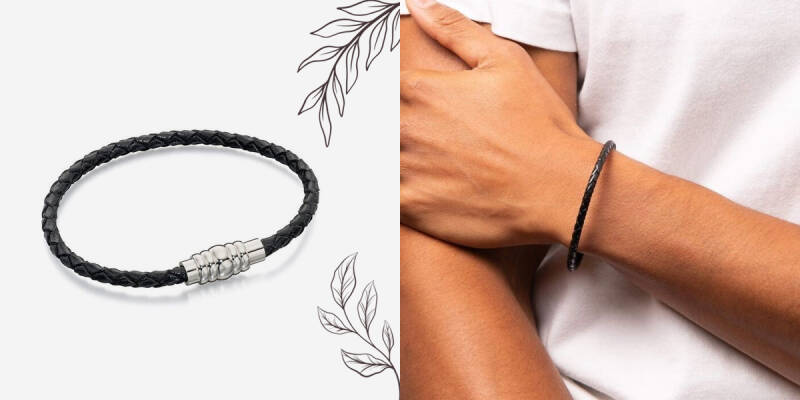 Fred Bennett Bracelet B4725 Black Plaited Leather Bracelet with Steel Section