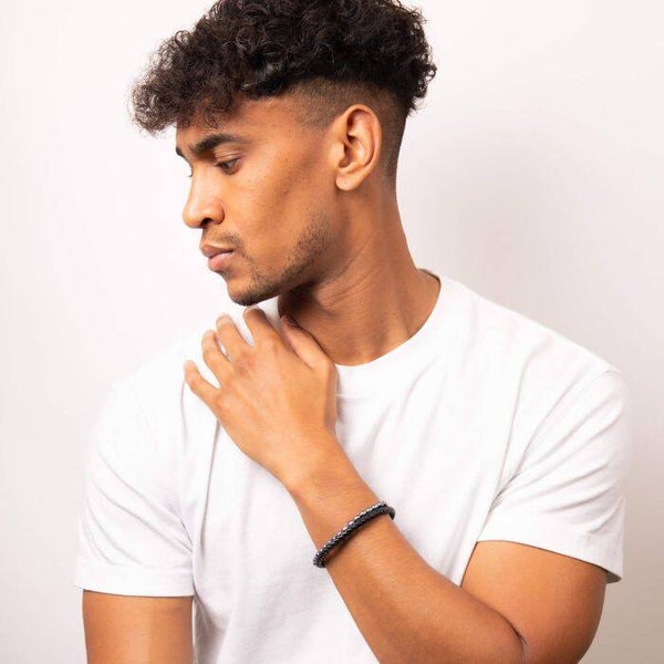 This bracelet effortlessly combines classic elements with a modern edge, making it the perfect accessory for any occasion. Crafted in stainless steel and recycled leather, the peacock pearls add a touch of opulence, while the black leather exudes a rugged charm. Whether you're dressing up for a formal event or adding a touch of sophistication to your everyday attire, this bracelet is the ideal companion. It's a statement piece that complements your style, reflecting confidence and exploring iconic classic styles with a unique twist. Why not stack on the wrist with other Fred Bennett bracelets to personalise your style!