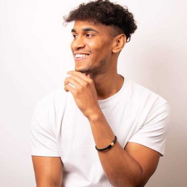 Perfect for everyday wear, this bracelet is crafted from black recycled leather for an eco-friendlier result. With a total length of 22cm, this bracelet features black IP and yellow gold plated stainless steel sections. This piece makes an ideal gift for those who are mindful of the sustainability of what they buy and can be stacked with our other recycled leather bracelets for a unique style!
