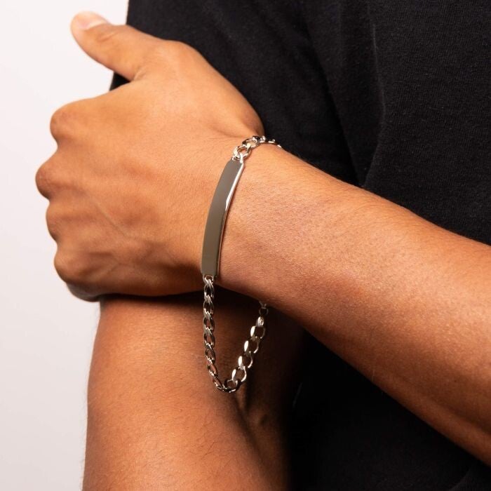 With this collection focusing on nature and well-being, this chain bracelet has been created with kindness to the planet in mind by being crafted using recycled sterling silver with a platinum plating. Featuring a length of 23cm and showcasing a plain ID bar which is perfect for engraving, why not personalise this bracelet with a name, drawing or handwriting for a sentimental gift for a loved one! Co-ordinate your style by stacking with other chain detail items such as our ID Bar curb chain ring too!