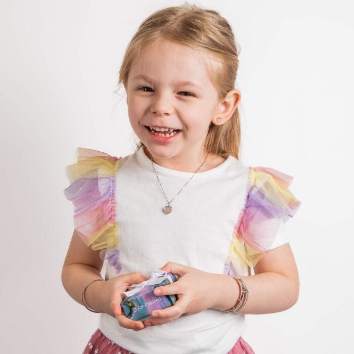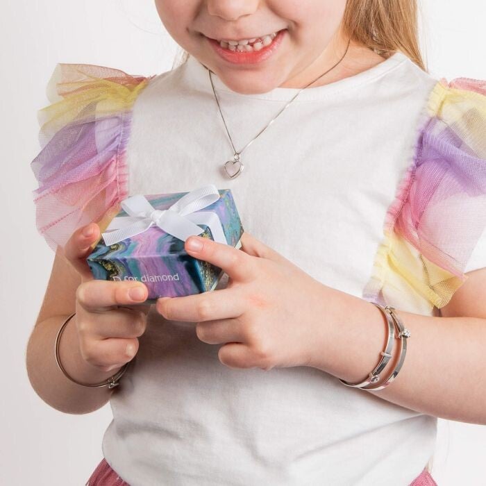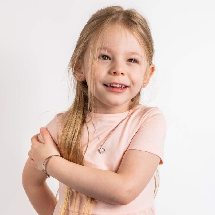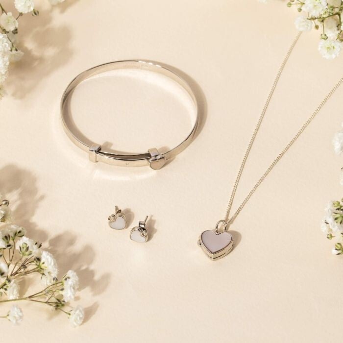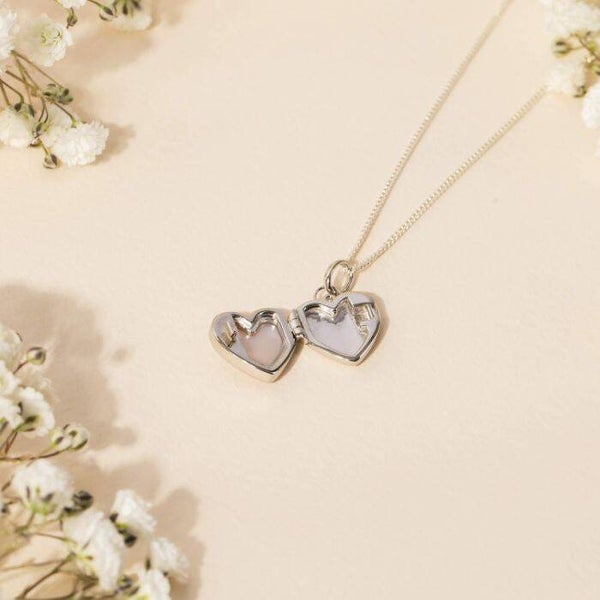 A timeless keepsake to hold precious memories close, this locket is beautifully crafted in recycled sterling silver with a radiant platinum plating. The heart shaped design features a luminous mother of pearl inlay with a delicate diamond accent adding a subtle sparkle. Open to reveal space for a tiny photo or engraving for a personal touch, this sentimental piece is perfect for christenings, birthdays, and special milestones. This locket pairs beautifully with the matching stud earrings and expandable bangle, creating a cherished collection to be treasured for years to come.