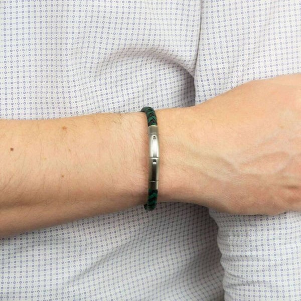 Crafted from forest green and black braided leather, this bracelet offers a bold yet versatile accessory for any wardrobe. The contrasting tones and intricate weave create a distinctive look, making it an effortless addition to both casual and smart styling.